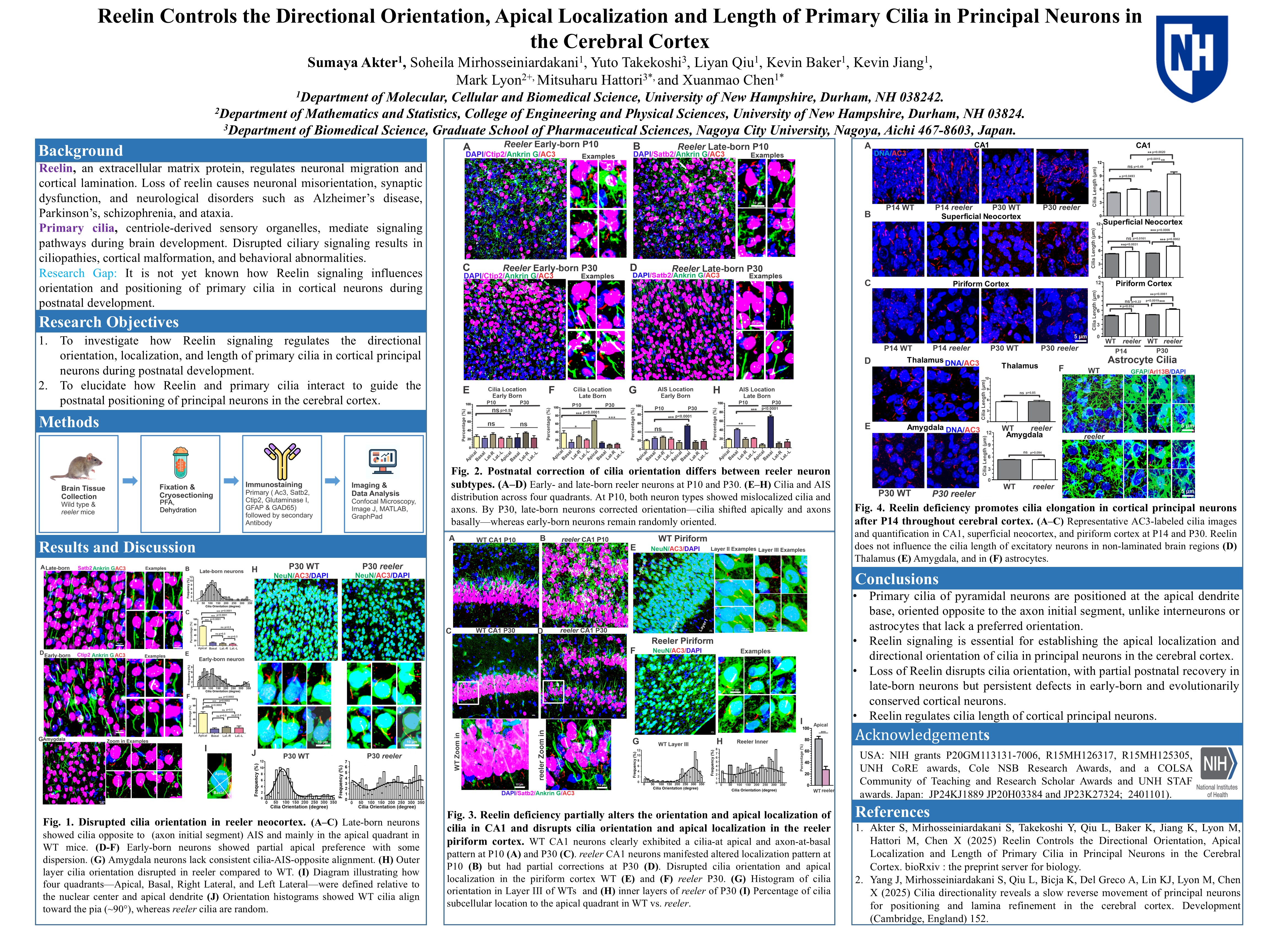Primary cilia are microtubule-based organelles present on nearly all mammalian cells, including neurons. It is well-known that primary cilia modulate embryonic neurodevelopment. Currently little is known about the roles of neuronal primary cilia in postnatal neurodevelopment. Defects in primary cilia cause neurodevelopmental disorders, obesity, and cognitive impairment. Reelin, a glycoprotein secreted by Cajal–Retzius cells, is essential for neuronal migration and cortical lamination. While Reelin’s role in guiding laminar organization is well established, its influence on primary cilia dynamics and centriole positioning during postnatal development remains unclear. In this study we investigated whether Reelin influences cilia length, centriole positioning, and cilia directionality in the mouse cerebral cortex.