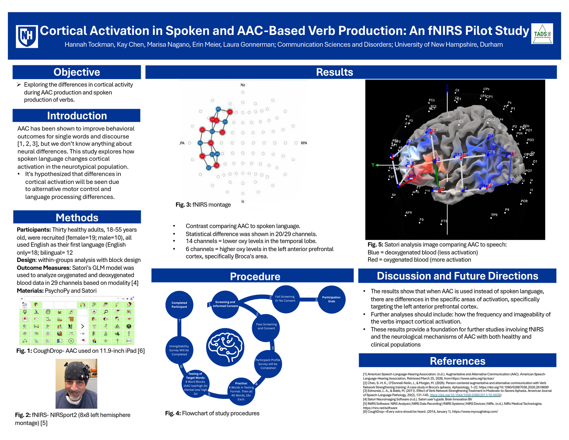 Healthy participants (N = 31) were recruited to produce 40 target verbs both verbally and via an AAC system consisting of CoughDrop software installed on a touchscreen tablet (CoughDrop, 2014). For this study, a touch-based Quick Core 60 board including a home display of a 6x10 grid was used. Twenty of the target stimuli verbs were low frequency (e.g., quaff, hearken) and twenty high frequency (e.g., fall, show), as determined by the Corpus of Contemporary American (COCA) English data (COCA, n.d.). Verbs were chosen over other parts of speech since the success of communicating a meaningful message (either verbally or via AAC) relies heavily on verb retrieval and production, as verbs act as the backbone of a coherent sentence (Edmonds & Babb, 2011). NIRx Sport2 (8 by 8) fNIRS system was used to collect fNIRS data in conjunction with Satori software, which was used to analyze the data (Satori Neuroimaging Software, n.d.).