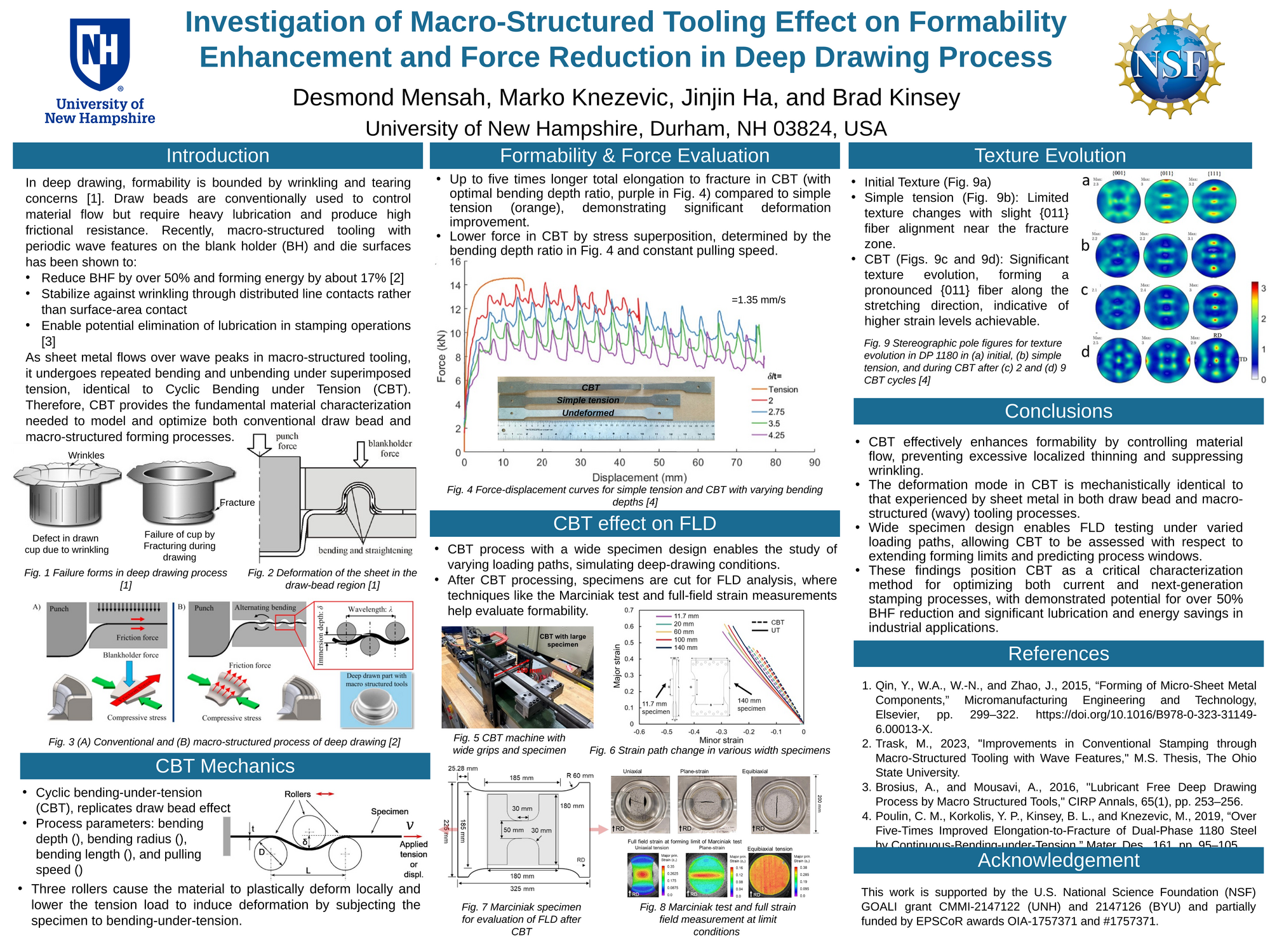 Using a CBT setup with varying bending depth ratios, force-displacement response, forming limits, and texture evolution were evaluated. Compared to simple tension, CBT yielded up to five times greater elongation to fracture and reduced forming force through bending-induced stress superposition. Marciniak testing with full-field strain measurement on CBT-processed specimens demonstrated extended forming limits, while pole figure analysis revealed pronounced {011} fiber development along the stretching direction. These results position CBT as a critical tool for optimizing next-generation stamping processes.