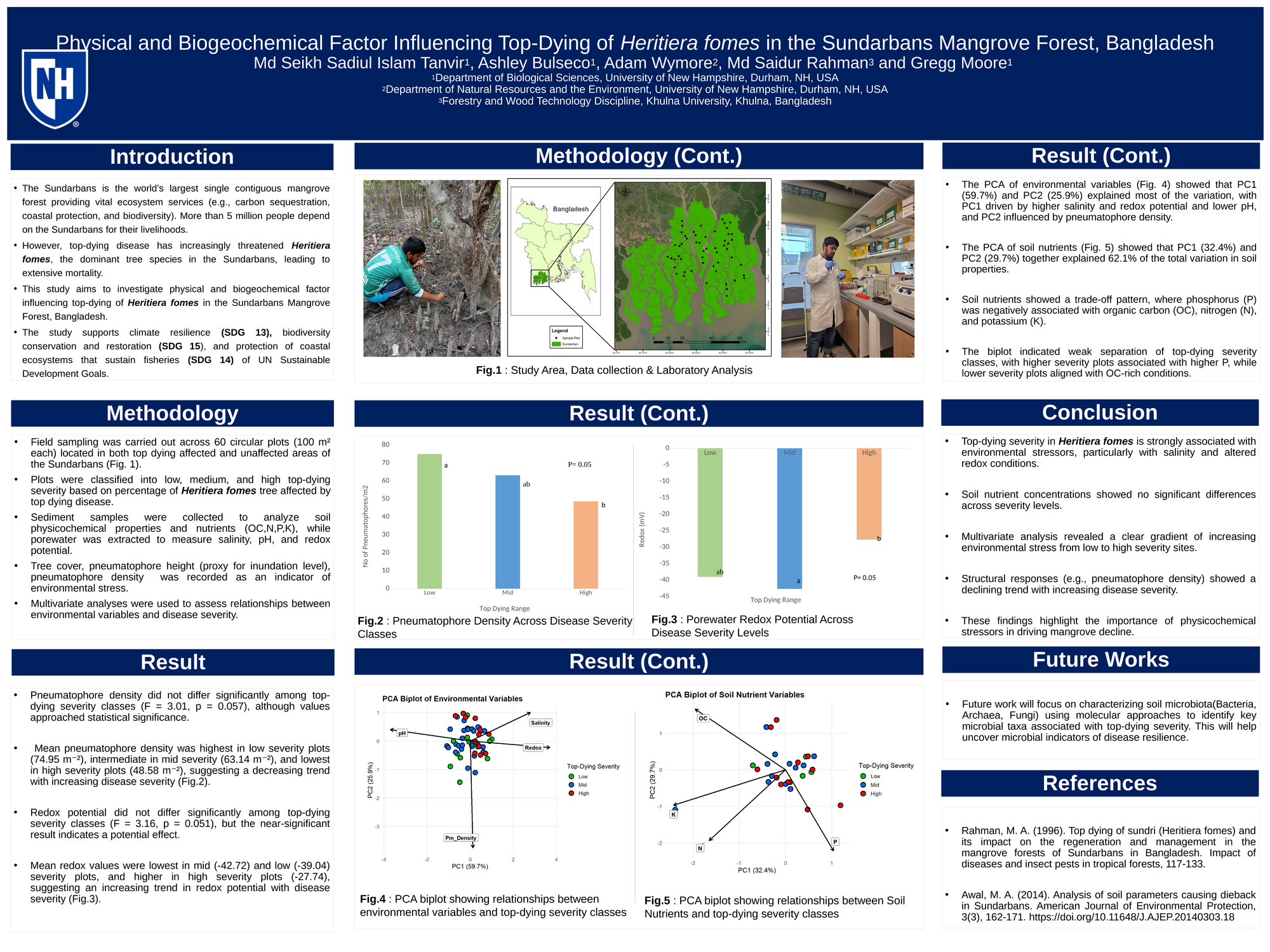 The Sundarbans is the world’s largest single contiguous mangrove forest, providing vital ecosystem services (e.g., carbon sequestration, coastal protection, and biodiversity). More than 5 million people depend on the Sundarbans for their livelihoods. However, top-dying disease has increasingly threatened Heritiera fomes mangrove, the dominant tree species in the Sundarbans, leading to extensive mortality. This study aims to investigate sediment and porewater chemistry in three different severities of top-dying: high, medium, and low. We have collected sediment, pore water and other environmental variables from 60 randomly distributed sample plots. Multivariate analyses of environmental stress factors indicated that elevated salinity, reduced redox potential, and increased pneumatophore height were the primary drivers differentiating high top-dying severity sites compared to low and mid-severity areas. In contrast, soil nutrients revealed no significant differences or distinct clustering among the severity levels.