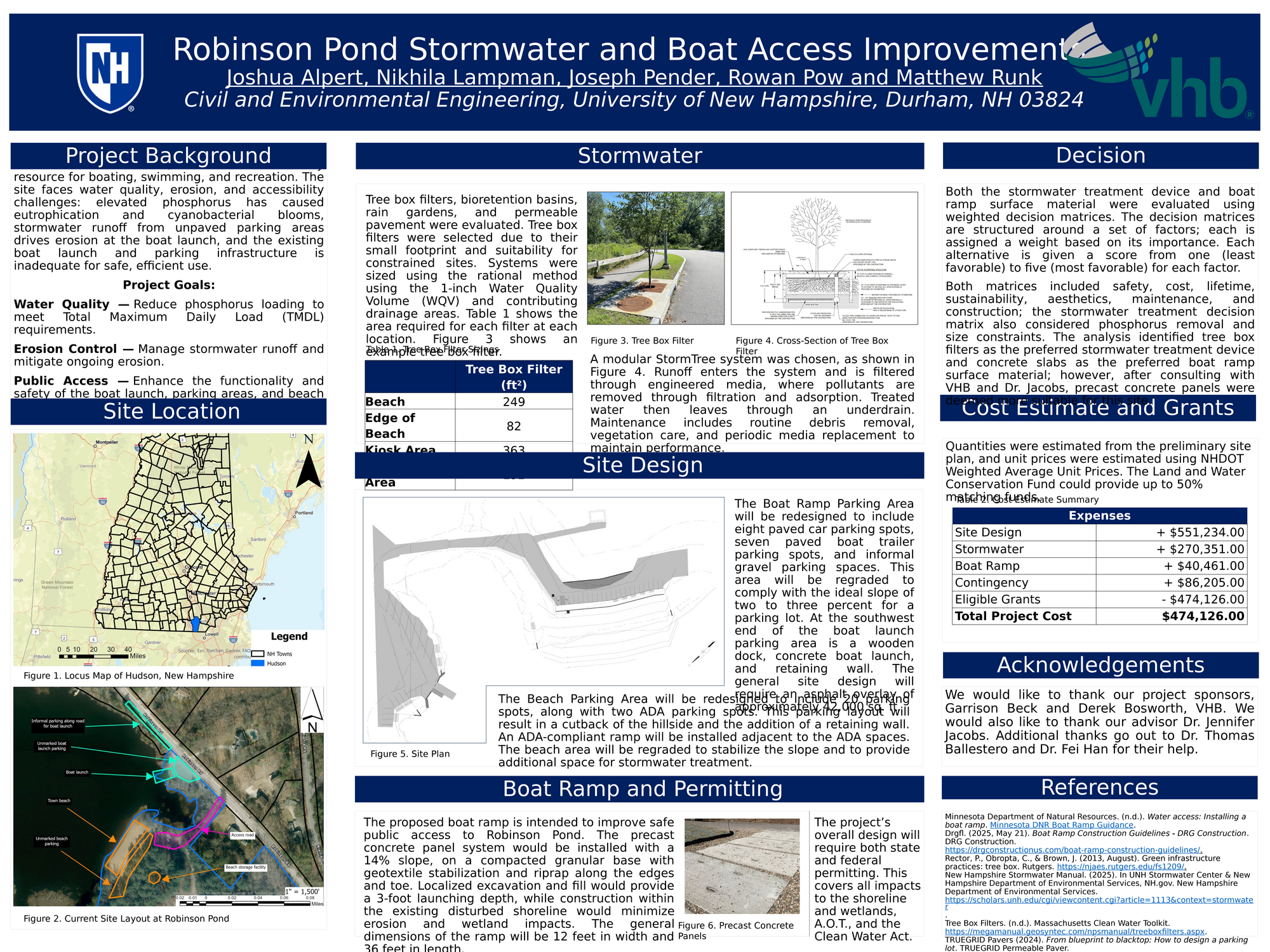 Robinson Pond in Hudson, New Hampshire, is an important public resource that supports boating, swimming, and other recreational uses. Despite its value to the community, the site faces ongoing challenges related to water quality, erosion, and public access. Elevated phosphorus concentrations have contributed to eutrophication and cyanobacterial blooms, while stormwater runoff from unpaved parking areas has increased erosion near the boat launch. In addition, the existing boat launch and parking layout do not adequately support safe and efficient use of the site. This project evaluates improvements intended to reduce phosphorus loading in support of Total Maximum Daily Load requirements (TMDL), manage stormwater and limit further erosion, and enhance the safety and functionality of the boat launch, parking areas, and beach access. Together, these improvements aim to strengthen both the environmental condition and overall public usability of Robinson Pond.