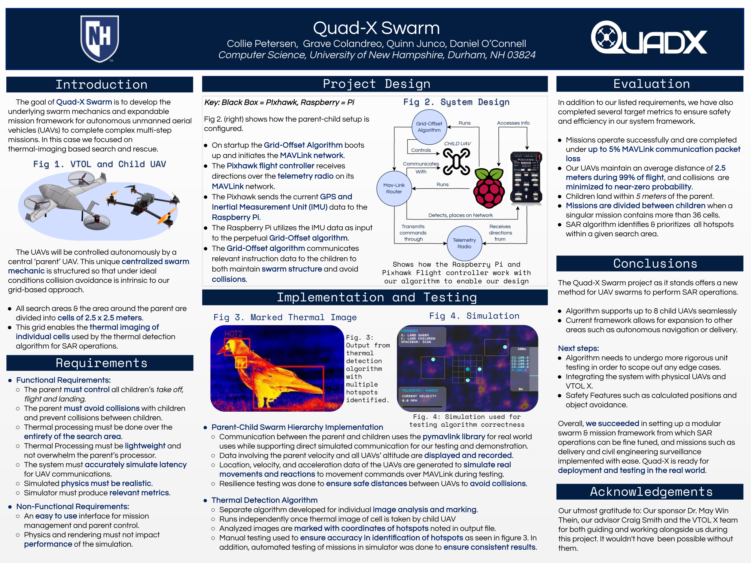 Quad X is an interdisciplinary project, advised by Dr. May Win Thein, dedicated to developing an expandable mission framework for synchronous swarms of UAVs. The project addresses the critical need for efficient disaster relief and Search and Rescue (SAR) operations by leveraging a unique centralized swarm architecture. Under this framework, an autonomous "parent" UAV serves as the central command and logistics hub, managing the distribution of supplies while simultaneously directing a fleet of "child" quads. These smaller units are equipped with thermal sensors to conduct wide-area search efforts. A core innovation of Quad X is its grid-based control system, which ensures that collision avoidance is intrinsic to the flight path under ideal conditions. Furthermore, this grid structure optimizes data processing by partitioning the search environment into discrete cells, allowing thermal data to be seamlessly translated into high-fidelity images for automated hot-spot detection. By integrating complex task delegation with a robust, scalable control mechanic, Quad X provides a foundation for autonomous systems to execute multi-step missions in high-stakes environments.