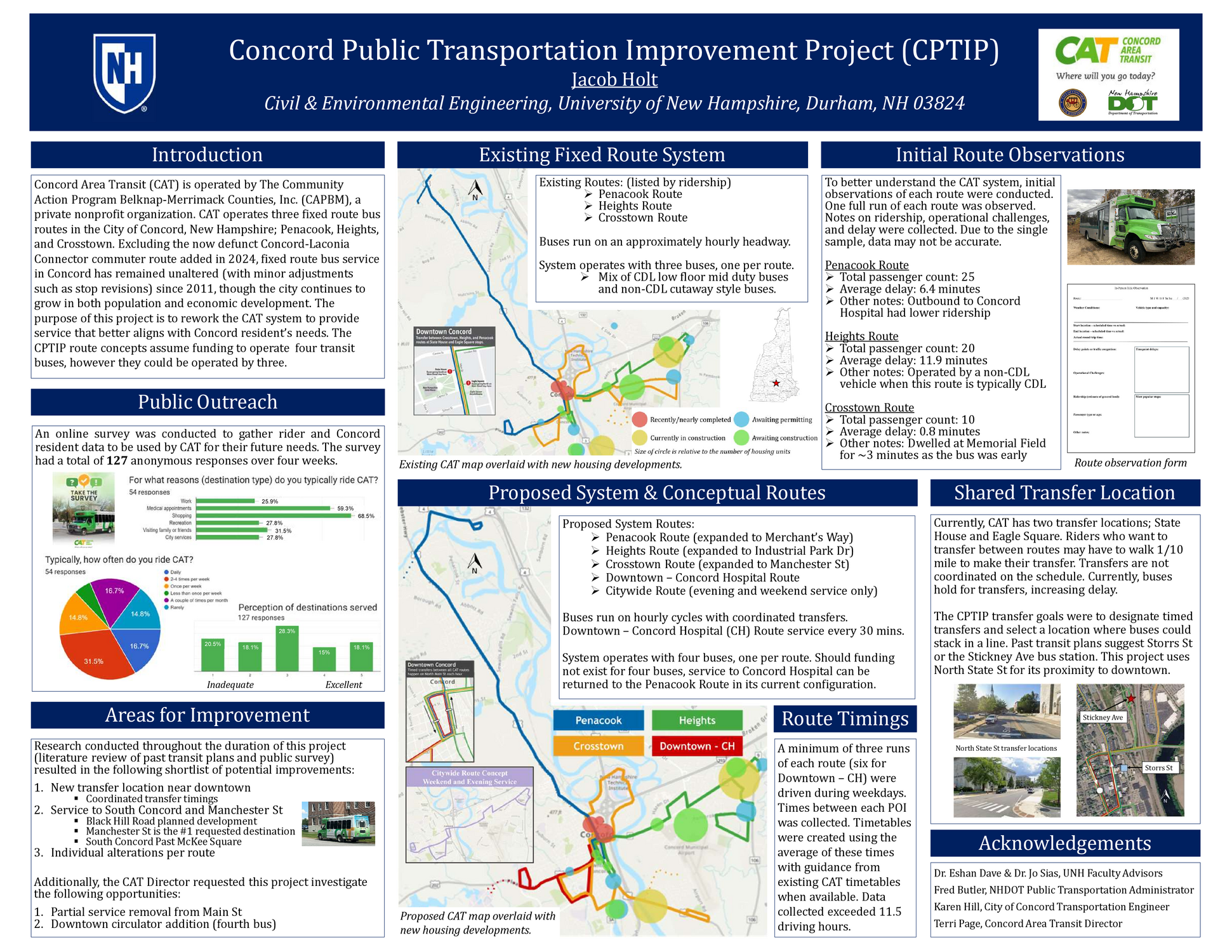 The capital city of Concord, New Hampshire, has been served by Concord Area Transit (CAT) since 1989. Despite continued population growth and economic development within the city, CAT’s fixed route bus system has remained unaltered since 2011. The purpose of this project is to rework the CAT system to provide service that better aligns with Concord resident’s current needs. A public survey was conducted to gather data regarding Concord resident’s needs, habits, and perception of the existing system, which was used in the development of the revised system. The project includes suggestions for both system-wide and route-specific modifications. Key changes include the introduction of a new transfer location on North State Street with coordinated transfer timings across all routes, as well as two new routes. The redesigned system expands service to Manchester Street, which has not seen service since approximately 2008. The two proposed routes introduce CAT’s first 30-minute frequency route and the first evening and weekend service for the city.