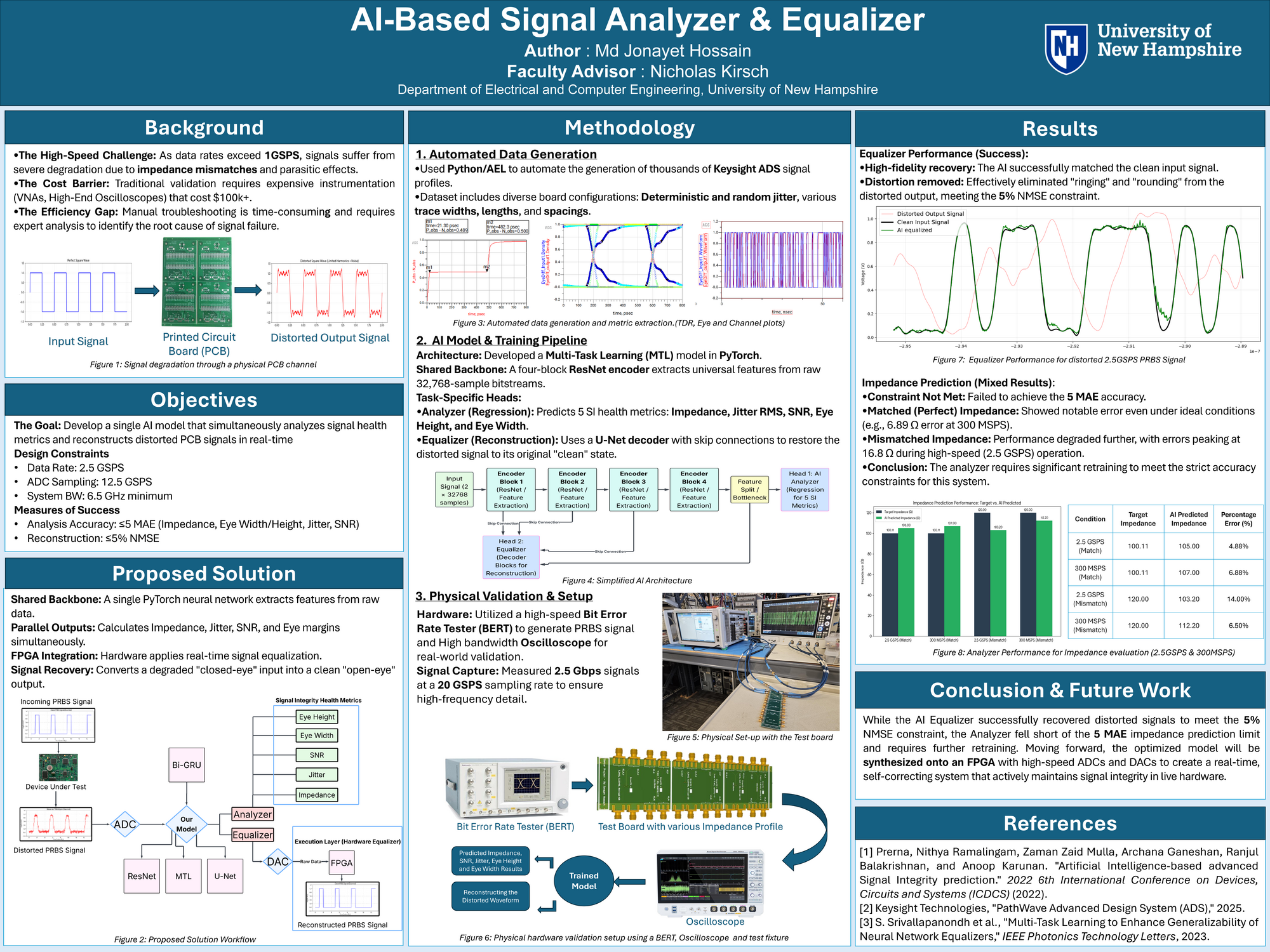 The system was trained on automated datasets from Keysight ADS and validated using a physical Bit Error Rate Tester (BERT) and oscilloscope setup. Results indicate that the AI Equalizer successfully recovered distorted signals, achieving a Normalized Mean Square Error (NMSE) of less than 5%. However, the Signal Analyzer requires further refinement, as it currently falls short of the 5 MAE (Mean Absolute Error) accuracy target for impedance prediction. Future work will focus on optimizing the model for FPGA integration to enable real-time, self-correcting signal integrity management.