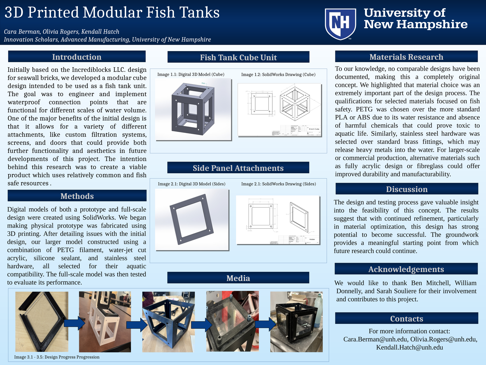 Initially based on the Incrediblocks LLC. design for seawall bricks, we developed a modular cube design intended to be used as a fish tank unit. The goal was to engineer and implement waterproof connection points that are functional across different water volumes. The intention behind this research was to create a viable product that uses relatively common and fish-safe resources.