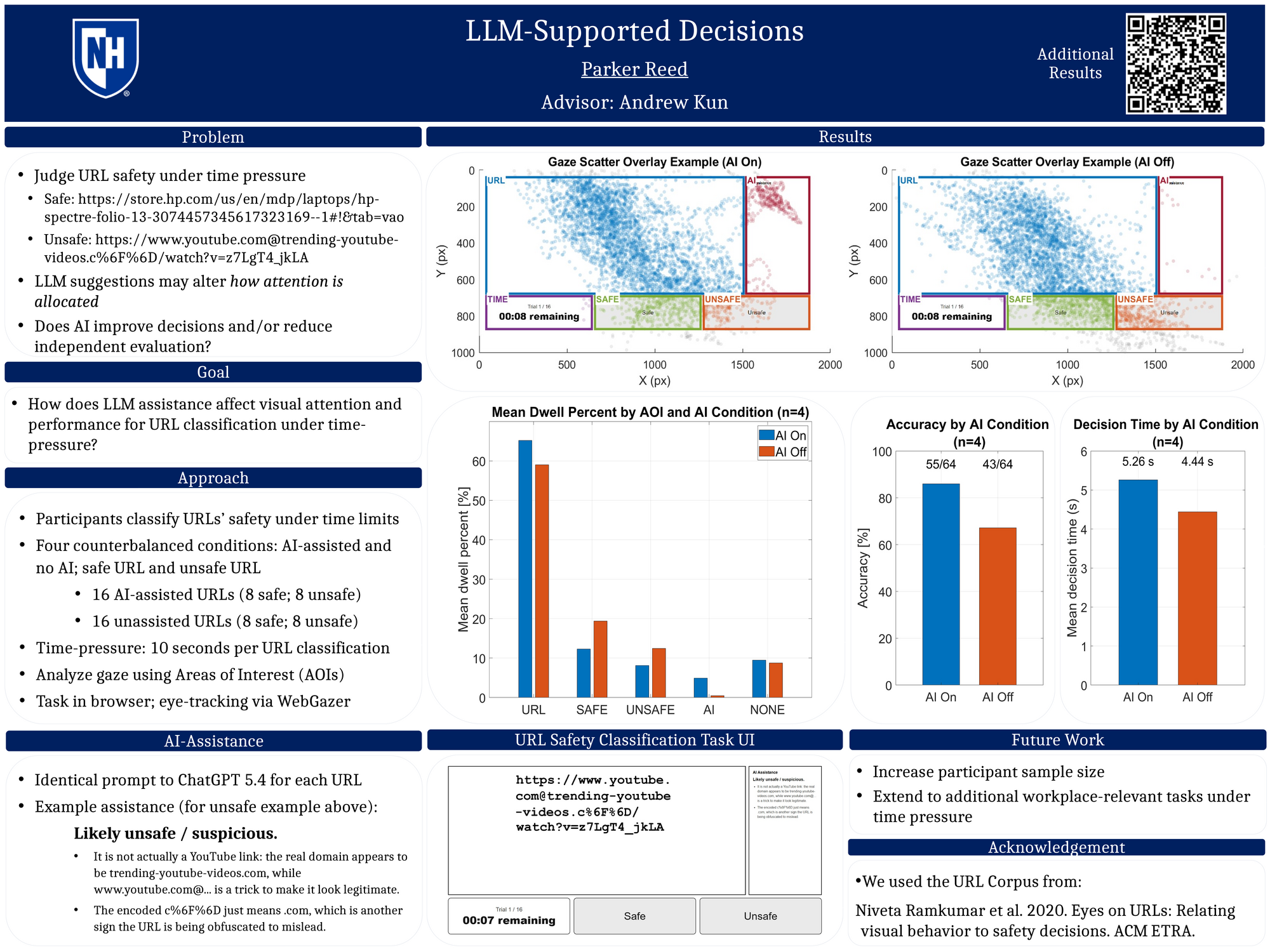 This project investigates how AI assistance influences user attention and decision-making during online safety judgments. A browser-based experimental platform was developed using webcam eye-tracking to measure where users look while evaluating the safety of website URLs. Participants completed two counterbalanced task runs—one with AI-generated guidance and one without—while gaze data and behavioral responses were recorded in real time. The system captures attention allocation across defined interface regions and synchronizes gaze with user actions to enable detailed analysis. Results from a pilot study indicate that AI assistance alters visual attention patterns, increasing focus on guidance-related content, while also impacting decision speed and accuracy. These findings suggest that AI tools can meaningfully shape how users process information, with implications for interface design, cybersecurity education, and human-AI collaboration. Future work will expand the participant pool and refine AI feedback strategies to better understand how assistance can improve user outcomes without over-reliance.