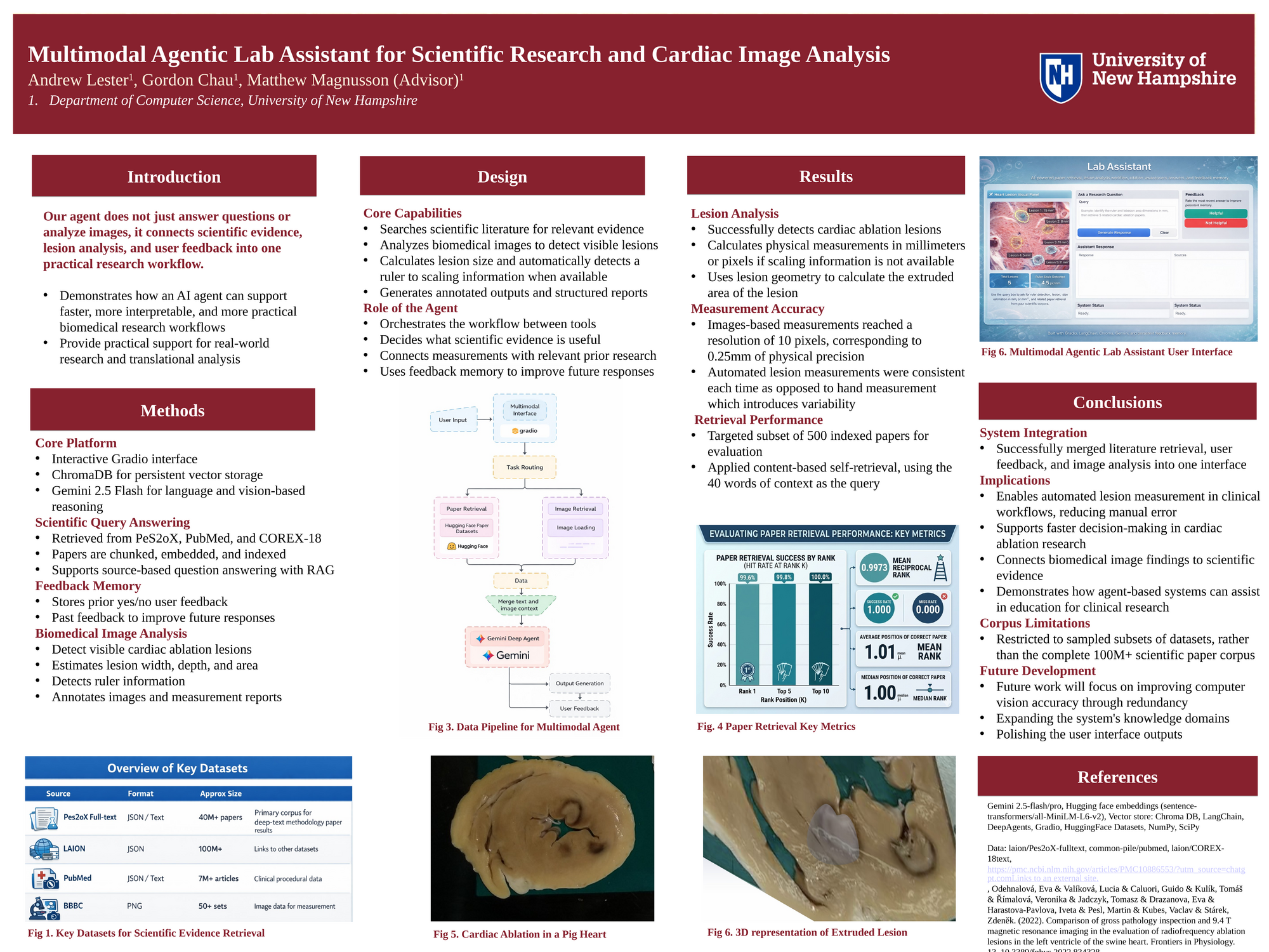 Laboratory research still relies largely on doing manual tasks, specifically extracting scientific evidence from literature and measurements from biomedical images. The Multimodal Agentic Lab Assistant unifies both in a single interactive workflow and connects research based evidence to help support results from experimental lab work. The agent was built on Gemini 2.5 Flash and orchestrated via LangChain and DeepAgents and decides which tools to invoke for each query. Additionally, it chains literature retrieval with image analysis, and consults a feedback-memory tool that stores preferred response patterns and avoids rejected ones. Developed with a retrieval-augmented pipeline, the agent indexes chunked papers from PeS2oX, PubMed, and COREX-18 to answer scientific questions with cited sources. Image analysis was developed with a vision module that detects cardiac ablation lesions, auto-locates a ruler when present, and reports lesion width, depth, and extruded area. In practice, researchers and students can cut manual measurement error, move from image to measurement to cited evidence in one session, improving efficiency and accelerating decision-making in cardiac ablation research and clinical education.