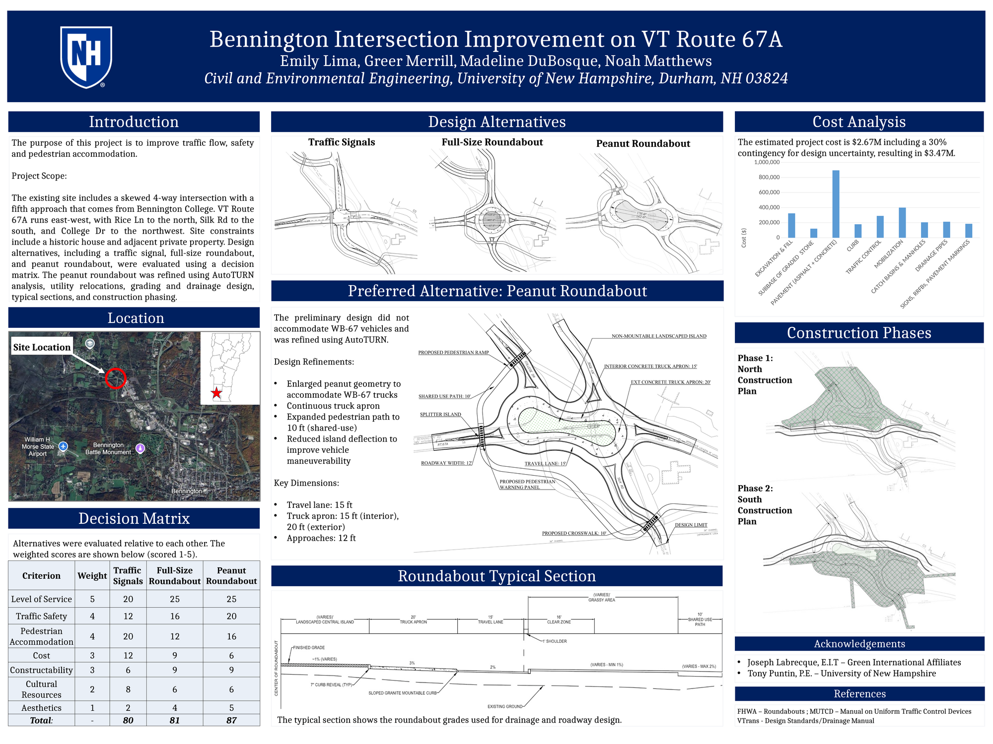 Green International Affiliates were assigned an intersection improvement project - located in Bennington, VT. Intersection improvement alternatives were developed for the Bennington intersection at VT-RT 67A between Silk Rd/Rice Ln/and College Dr. Design alternatives including traffic signals, full-size roundabout, and peanut roundabout – were developed in the interest of improving traffic flow, safety, and pedestrian accommodation. Existing conditions and site constraints were considered in the development of AutoCAD plans for each alternative. Based on evaluation of these alternatives using a decision matrix, the peanut roundabout was selected as the preferred alternative due to its superior performance in terms of operational efficiency and safety. After selection of the preferred alternative, the design was geometrically redefined using AutoTURN. A preliminary grading plan was developed to ensure proper drainage and constructability throughout the project limits. A stormwater management system was developed in coordination with the grading plan to ensure proper drainage in the site. Utility relocation was also addressed for the proposed design. To safely and efficiently maintain traffic throughout the construction process, both a detour plan and a construction phasing plan were developed. VT Route 67A will remain open using temporary roadway alignments as a part of the two-phase construction plan. Traffic from minor approaches will be rerouted using two primary detour routes.