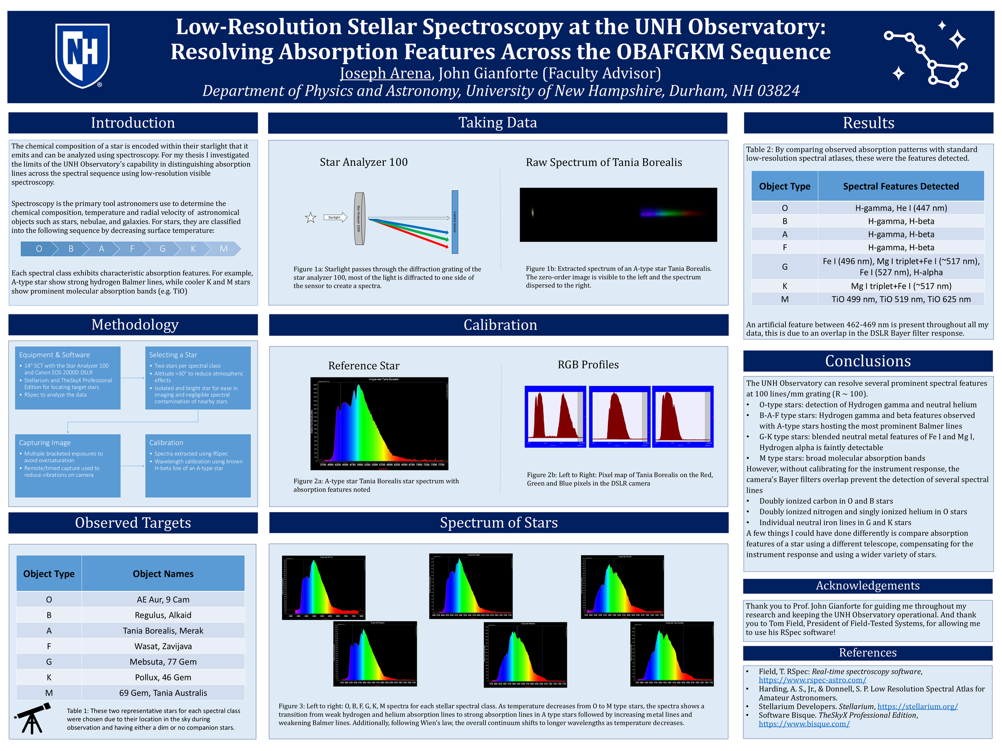This study explores the capability of the UNH Observatory’s 14” Schmidt-Casegrain telescope to resolve stellar absorption features across the OBAFGKM spectral sequence. Low-resolution spectra were obtained with the Star Analyzer 100 and a DSLR camera, using RSpec; absorption features were resolved and compared with published spectral atlases. Prominent features detected include Balmer hydrogen lines, neutral helium, neutral iron, neutral magnesium, and TiO molecular bands. However, instrumental limitations and detector artifacts restricted the resolution of faint spectral lines. These results demonstrate that low-resolution spectroscopy can recover some of the dominant spectral characteristics in the visible regime of stars' electromagnetic spectra.