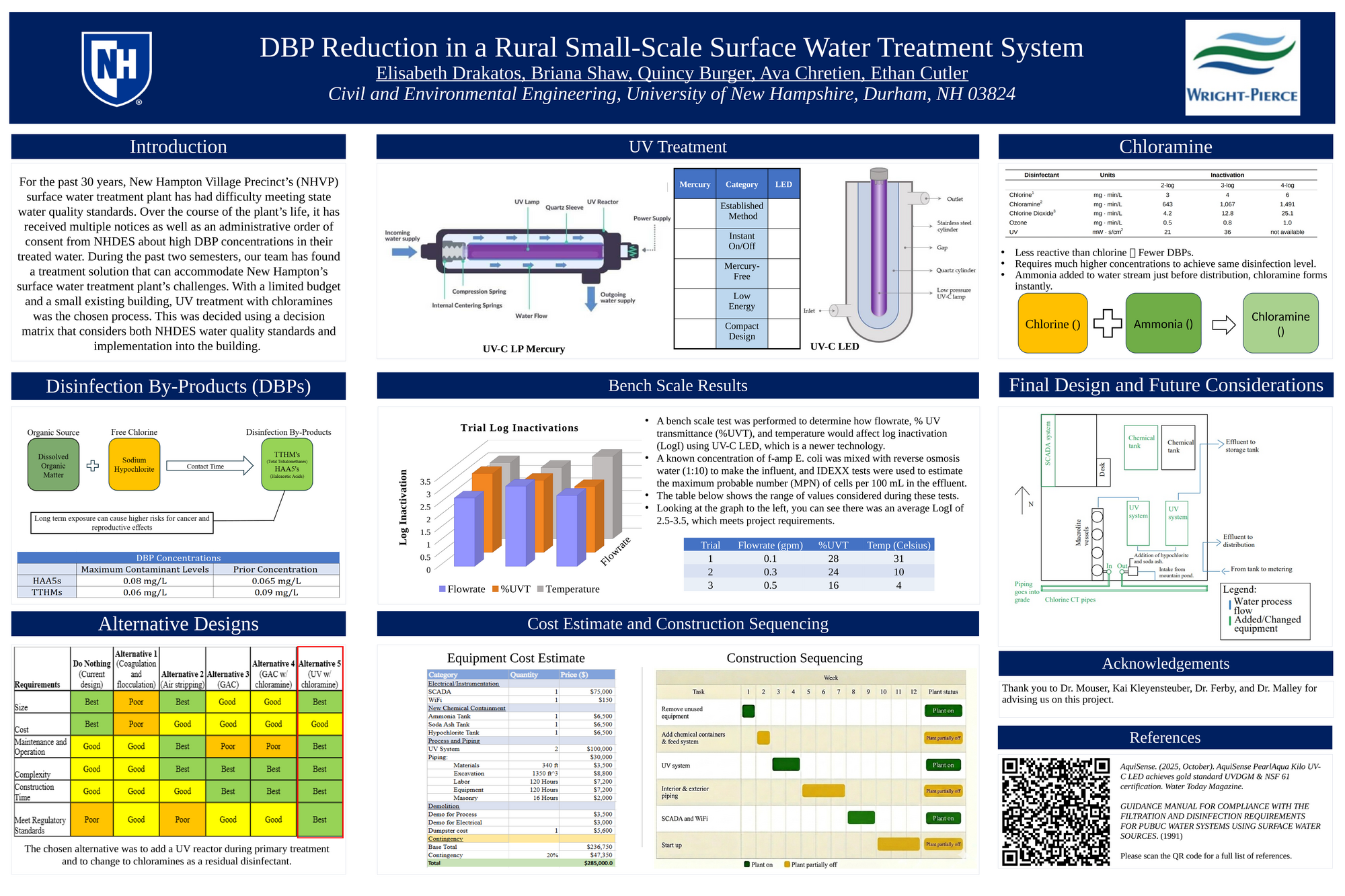 The New Hampton Village Precinct (NHVP) operates a small surface water treatment plant in New Hampton, New Hampshire. The precinct has reached out to Wright-Pierce and our team to find an alternate treatment process that will mitigate the formations of disinfection by-products (DBPs) in their drinking water. With budget and space constraints taken into consideration, the team decided to move forward with UV-LED treatment with chloramine disinfection as the chosen alternative for the treatment plant after choosing between five different alternatives. This choice is compact and cost-effective, while also meeting the water quality standards set by the U.S. Environmental Protection Agency (EPA) and enforced by New Hampshire Department of Environmental Services (NHDES). After selecting UV treatment, the team conducted bench testing to determine if UV-LED could be implemented instead of a traditional UV mercury lamp system. This included testing a UV-LED system for how many inactivation credits it can achieve as well as creating standard curves to better control the transmittance of the test water. After UV-LED was found to be a viable option, a construction sequencing outline was made which included when the plant can be left on and off for adjustments to the order in which our adjustments must be added and an estimate of the construction timeline. A cost estimate was also calculated including equipment and installation costs.