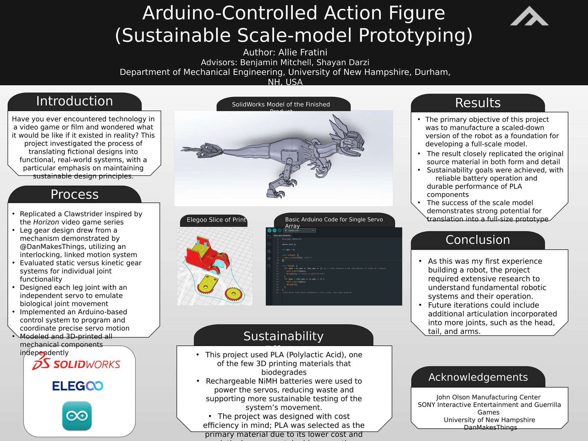 This project aimed to explore the process of scale-model prototyping, with a focus on sustainability. To accomplish this, PLA (Polylactic Acid) was used in the printing process. PLA is one of the few filaments that biodegrade. Along with that, NiMH rechargeable batteries were the power source for the servo array, limiting battery waste. The project was successfully created using these sustainable tactics, and proved that sustainability is not a handicap. These tactics can be applied to full-scale manufacturing, saving on costs and materials.