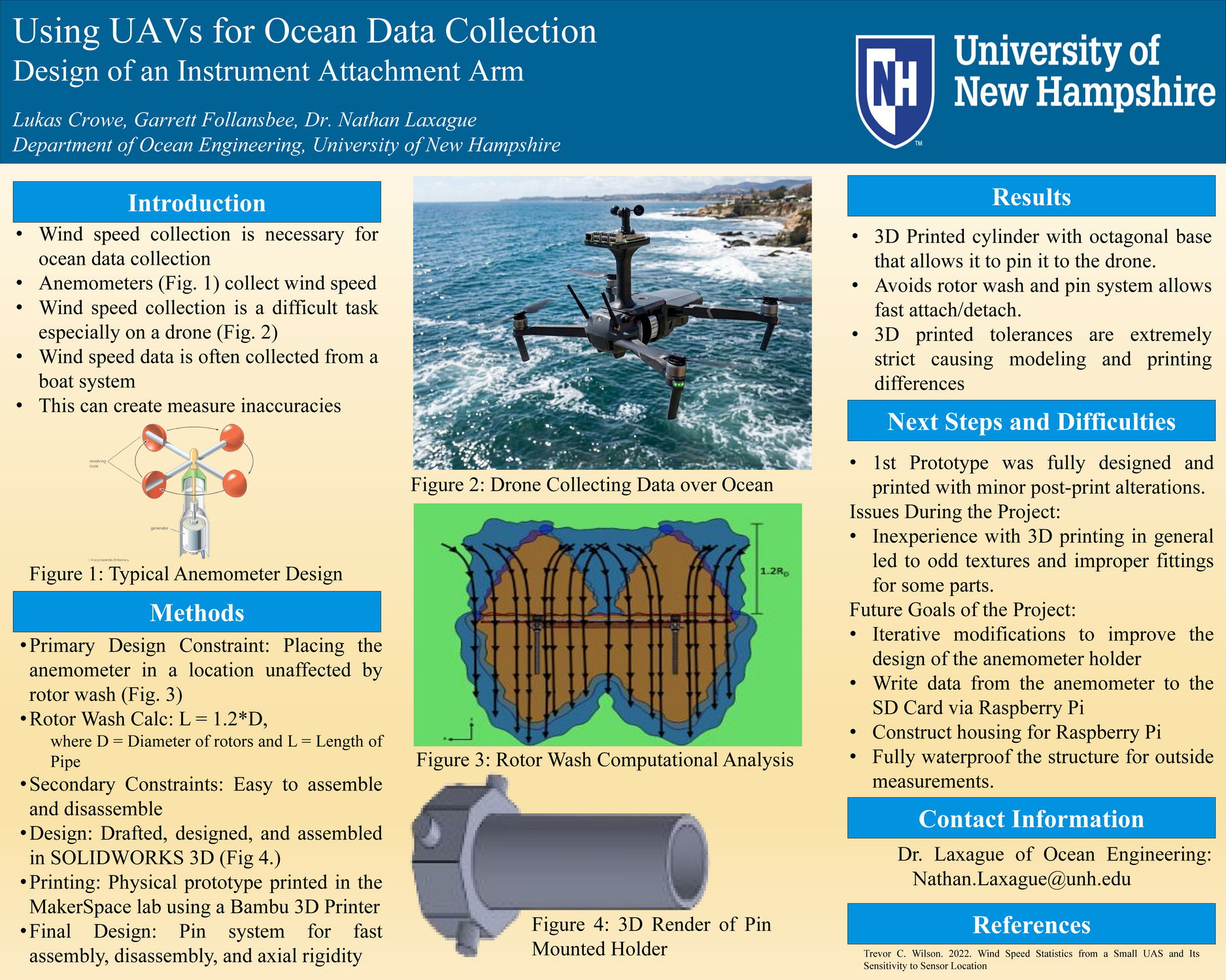 The purpose of this project is to work towards proving the viability of drone-based wind speed measurement systems for use in open ocean environments. Our main accomplishment for this project was the creation of a prototype anemometer holder that allowed for quick attachment and detachment, and it prevents rotor wash from interfering with measurements. The results of this project indicated that the best location for the placement of the anemometer was in the z-axis as opposed to the y-axis, with rotor wash affecting measurement for 5x the distance in the y-axis versus the z-axis (1.2 rotor diameters vs. 6 rotor diameters). If further testing and experimentation is done on this method, it may lead to a revolution in the way oceanographic wind speed data is measured, leading to more accurate models of oceanographic conditions at small scale locations.