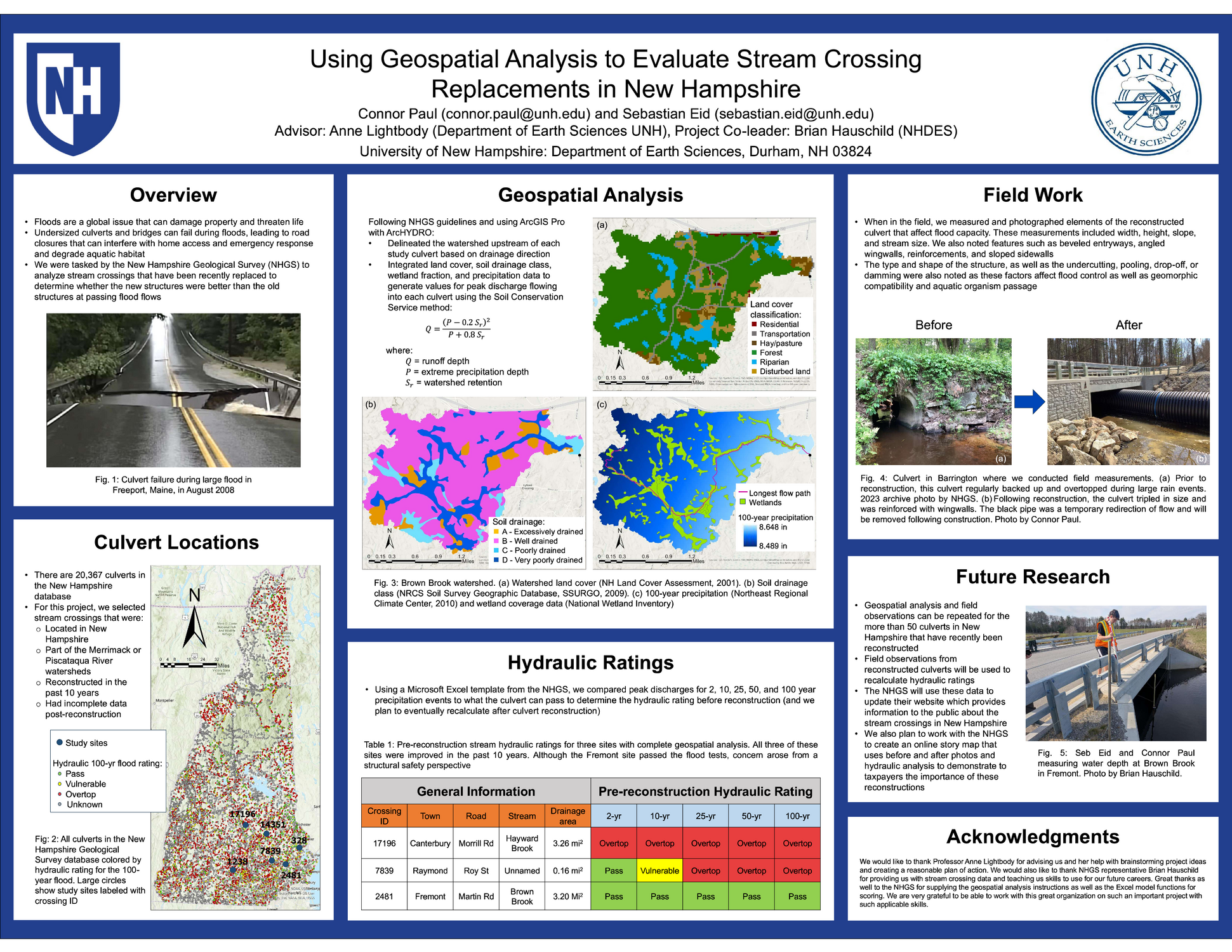 Using GIS analysis to compile data about stream crossings that have been recently replaced in New Hampshire. Our goal is to compare these crossings before and after replacement to see improvements in flood control, geomorphic compatibility, and aquatic organism passage. We are working with the NHGS on this project with the intent to have them make this information public to provide people with a more comprehensive understanding of these replacements.