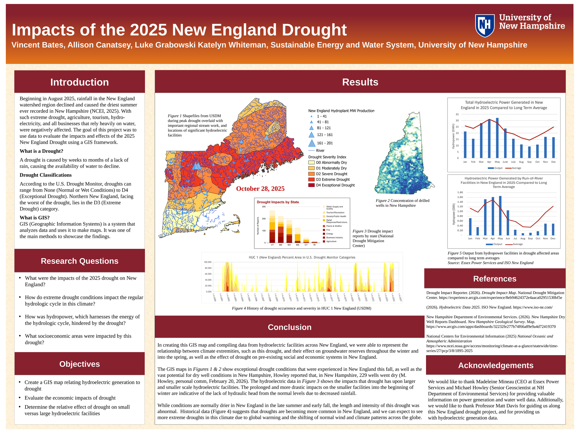 The 2025 New England drought is one of the largest recorded droughts that has happened in New England, causing the driest summer to have ever been recorded in New Hampshire. The purpose of this project was to find the impacts of the drought, how the conditions caused will impact regular hydrologic cycles, how the drought will affect hydropower, and what socioeconomic groups were affected the harshest. Data on the drought was gathered through research and python, and was used through Geographic Information System (GIS) and google sheets to make maps and charts, showing a visual representation of findings. The main sources of data for this project were from ISO - New England, the New Hampshire Department of Environmental Sources, and the National Centers for Environmental Information, as well as news outlets reporting on the incident throughout the summer. The main findings of this project show that the drought negatively impacts many of Northern New England's industries, like tourism and agriculture. GIS maps show exceptional drought conditions that were experienced this summer and fall, as well as the concentration of wells in New Hampshire. Charts show impacts the drought had on each state, and the impact on large and small hydroelectric facilities. Using historical data, abnormal droughts are becoming more common in New England, and these abnormal droughts can be expected to reoccur in the future because of global warming and shifting wind patterns.