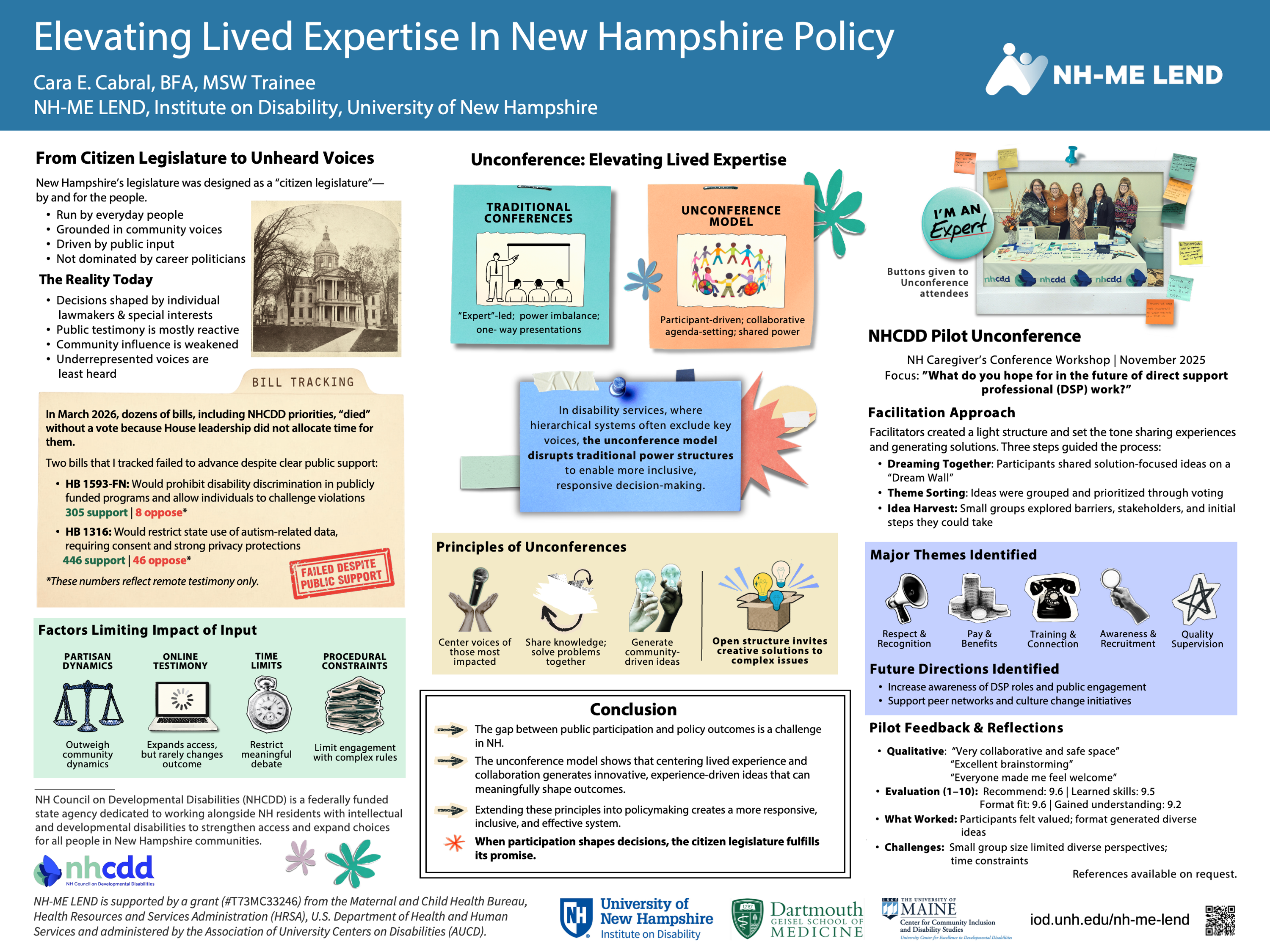 New Hampshire’s “citizen legislature” was built on the idea that lived experience should shape policy. Today, public input often fails to influence outcomes, even when engagement is strong. This poster examines that gap through disability policy examples and shows what it takes for participation to matter. In systems where hierarchical structures limit whose voices carry weight, participation alone is not enough—it must challenge the power structures that determine whose input shapes outcomes. This requires treating lived experience as expertise that informs decision-making. A pilot unconference shows how this can work in practice. By centering lived experience and allowing participants to set the agenda, it produced innovative, actionable, and community-driven solutions that reflect the priorities of those most affected. Reclaiming a citizen legislature requires embedding these principles into policymaking so public input directly drives decisions.