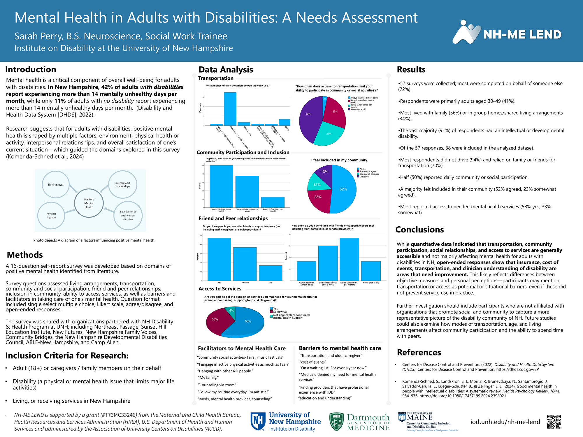 Adults with disabilities in New Hampshire experience significantly higher rates of poor mental health compared to adults without disabilities, highlighting the need to better understand contributing factors to positive mental health. This study used a 16-item survey grounded in a multidimensional framework of mental health, examining environmental, social, and access-related factors among adults with disabilities or their caregivers (n = 57). Results suggest that most respondents reported access to mental health services, some level of community inclusion, and regular social participation, despite high rates of non-driving and reliance on informal transportation supports. However, open-ended responses identified ongoing barriers including cost, insurance limitations, transportation challenges, and limited provider understanding of disability. Overall, findings indicate that while basic access may be present for many individuals, lived experiences of mental health support are still shaped by structural and social barriers. Further research should include more diverse recruitment strategies to better capture unmet needs within the disability community.